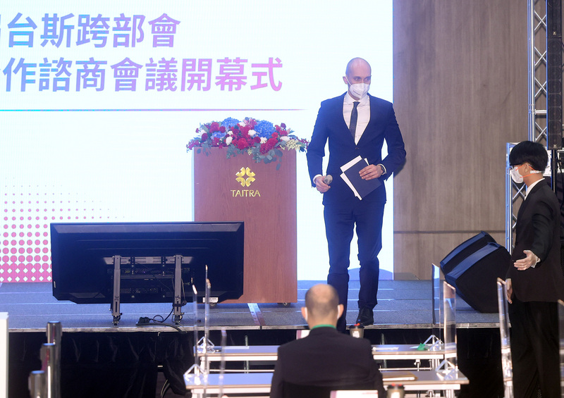 第一屆台斯跨部會經濟合作諮商會議開幕典禮6日在台北南港展覽館2館舉行,斯洛伐克經濟部政務次長佳雷克(Karol Galek)(後)出席,並在致詞尾聲用英文與中文各說一次,斯洛伐克支持台灣(Slovakia supports Taiwan)。(圖/中央社)