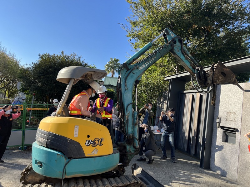 2021-12-07 13:34:32台中市第二選區立委補選將在明年一月投票,國民黨候選人顏寬恒,家族位於南屯區公共設施保留地上的招待所,捲入違建爭議;今天上午開始拆除,顏寬恒親自駕駛怪手敲下第一塊磚。s