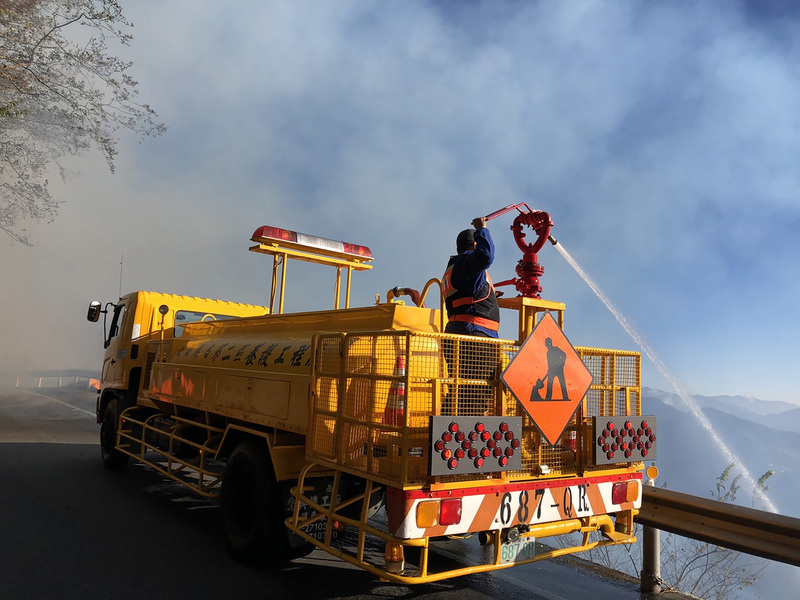 省道台14甲線合歡山公路翠峰路段下邊坡9日發生山林大火,火勢從山坡燒往公路,濃濃白煙阻礙行車視線,目前翠峰路段雙向交通管制。 (圖/公路總局提供)