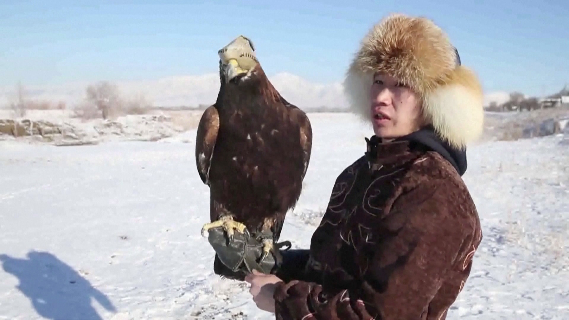 金鷹在主人的命令下騰空而起,展開長達2米的雙翼在空中盤旋,在鎖定地面的野兔或狐狸之後,便以300多公里的時速俯衝下來,在最後一刻收勢,張開鋒利的爪子將獵物抓住。