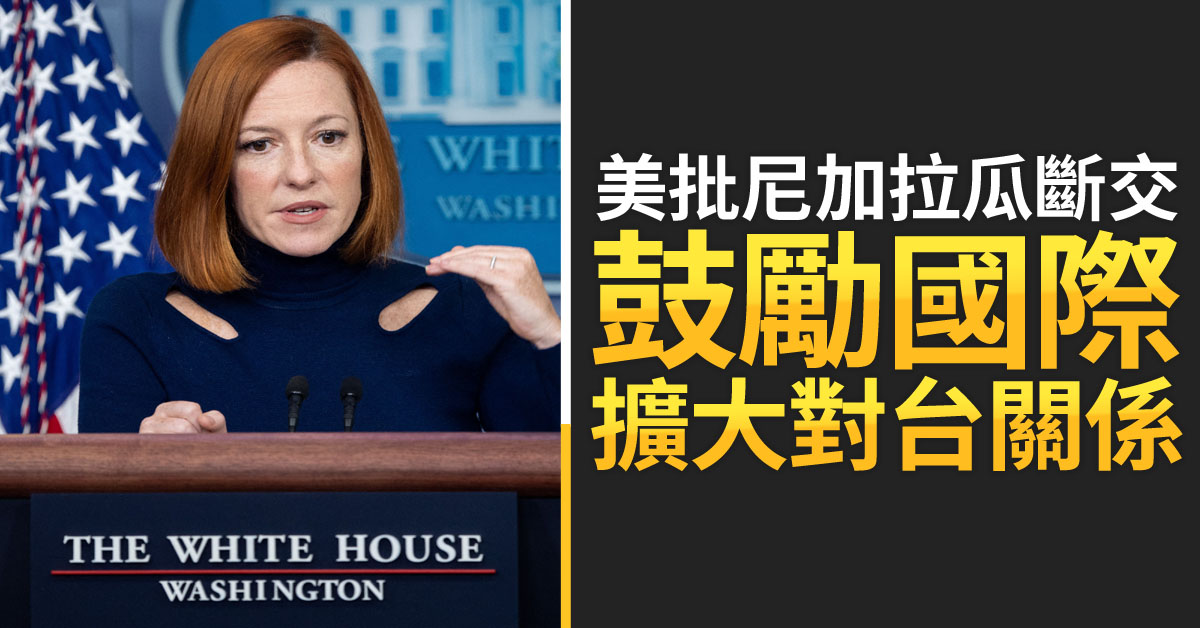 尼加拉瓜對台灣斷交,美國白宮發言人莎琪鼓勵其他國家擴大對台關係,國務院發言人普萊斯(Ned Price)也發出聲明指出,尼加拉瓜上個月虛假的總統大選欠缺合法性,因此總統奧蒂嘉(Daniel Ortega)片面的斷交決定,並不能代表尼加拉瓜人民的意願。