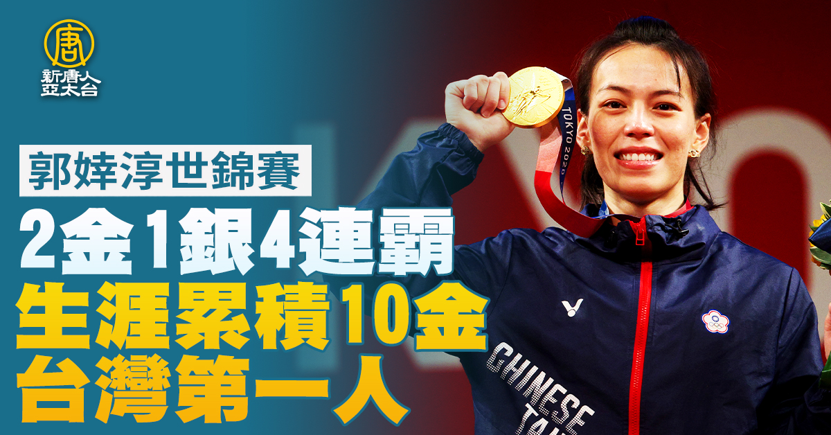 【新唐人亞太台 2021 年 12 月 12 日訊】台灣舉重好手郭婞淳昨天(11日)在世界舉重錦標賽女子59公斤級,以抓舉100公斤、挺舉130公斤、總和230公斤,順利摘下2金1銀, 不但總和成績在該量級寫下4連霸、完成生涯第5冠,且在世錦賽生涯共累計10面金牌,成為台灣舉重史上「最多金」的選手。