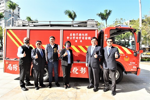 彰化縣不動產開發商業同業公會捐贈一輛小型消防水車,由理事長吳水富(右二)代表捐贈給彰化縣長王惠美(左四)。(彰化縣政府提供)