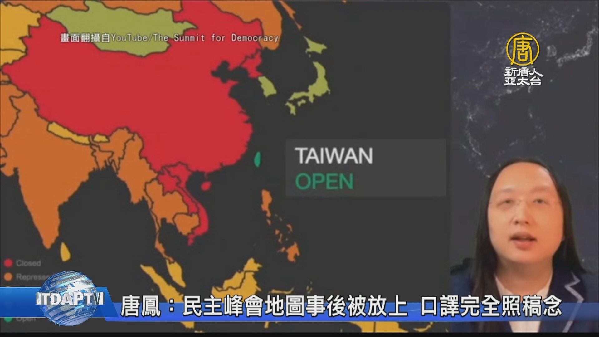【新唐人亞太台 2021 年 12 月 15 日訊】政務委員唐鳳上週10日受邀參與美國民主峰會,視訊出席時,秀出各國自由開放程度的地圖,但疑似因台灣與中國的顏色不一樣,讓美方緊急卡畫面。唐鳳今天上午受訪時回應,美方直播或事後放上的錄影檔都有完整顯示,而且他在會前就提供簡報的中英文內容,口譯是百分百是用他的稿子在念。另外,美國聯邦參議員盧比歐也為此致函拜登,質疑美國政府降低台灣出席等級,並在唐鳳演說時切掉畫面,痛批這是對中共的再一次讓步。共和黨籍聯邦參議員柯頓也表示,絕不相信這僅僅是個技術問題,「美國必須繼續與台灣站在一起,幫助確保台灣自治,並維持現狀。拜登總統不能向北京磕頭。」