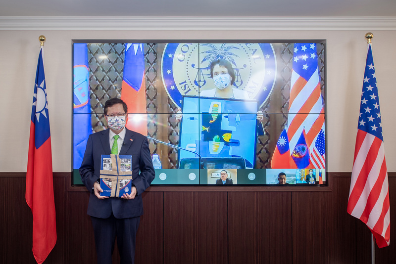 鄭文燦今天與盧爾德.里昂古蕾露(Lourdes A. Leon Guerrero)參與由駐關島台北經濟文化辦事處主辦、關島大學協辦透過視訊進行的「台灣—關島經濟高峰會暨姊妹城市協定簽約典禮」,鄭文燦也與里昂古蕾露簽署姊妹城市協定。