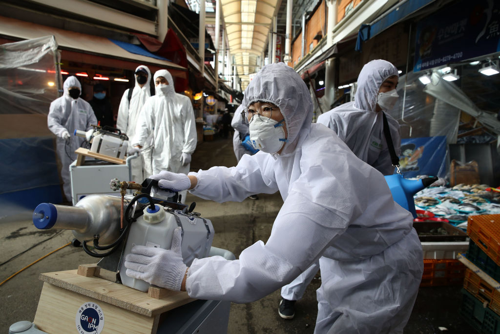 韓國突破性感染和重症病例持續激增,韓國疾病管理廳表示,14日新增7850人確診COVID-19、重症患者964人,雙雙創紀錄。 圖為在韓國首爾的一個傳統市場上,穿著防護服的消毒專業人員正在噴灑針對冠狀病毒 (COVID-19) 的消毒液。(圖/GettyImages)