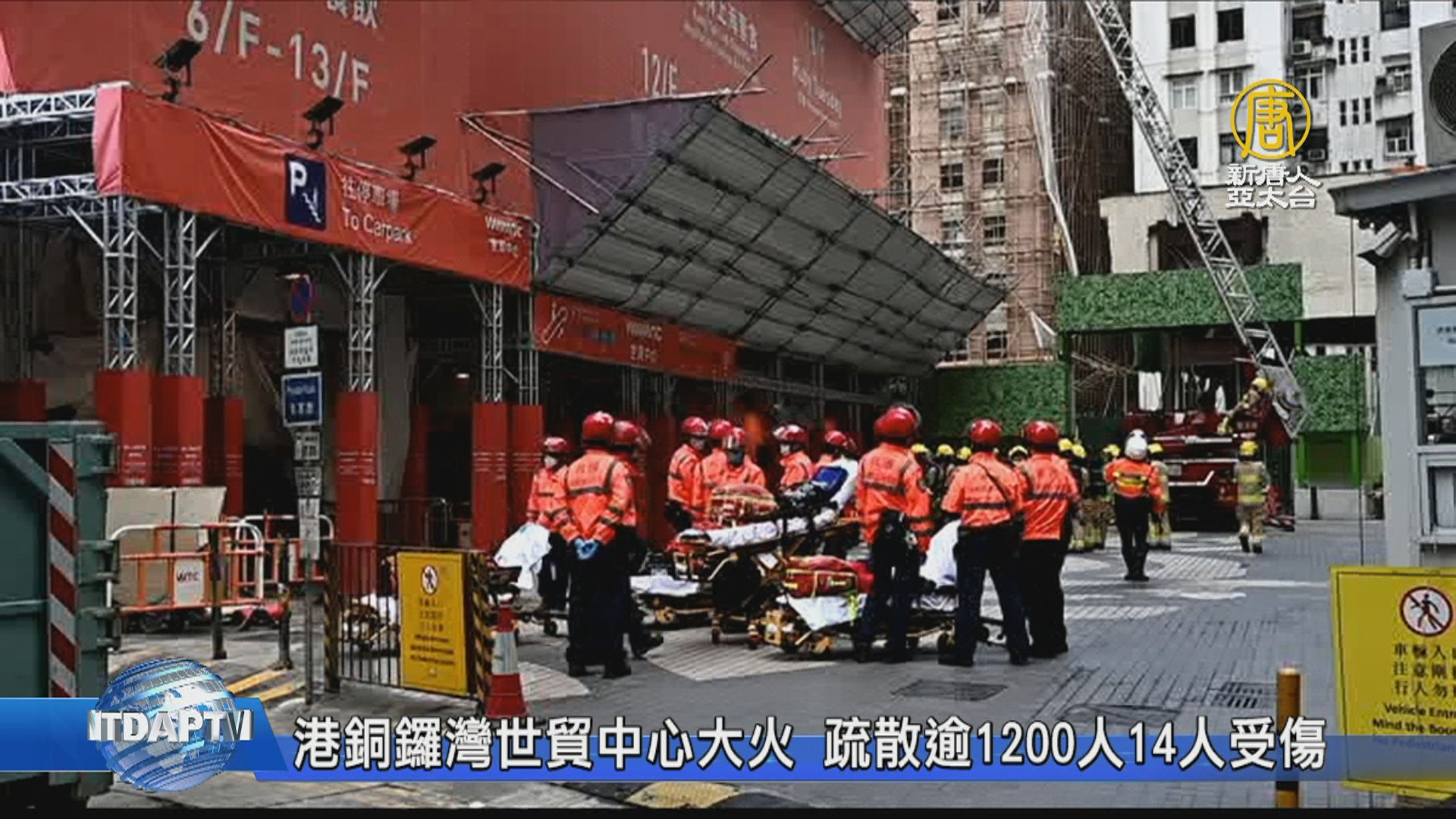 【新唐人亞太台 2021 年 12 月 15 日訊】鏡頭轉到香港。香港鬧區銅鑼灣世貿中心,今天中午發生大火,正在裝修工程的大廈冒出大量濃煙,消防隊灌水打火,並用雲梯車協助民眾脫困,大火直到下午4點多才被撲滅。現場約1270人被疏散,至少14人受傷送醫。世貿中心位於銅鑼灣怡東酒店旁邊,內有商場和餐廳,14樓到38樓是辦公室,最近,低樓層商場正在裝修翻新,外牆有棚架包圍,火災原因仍待後續釐清。