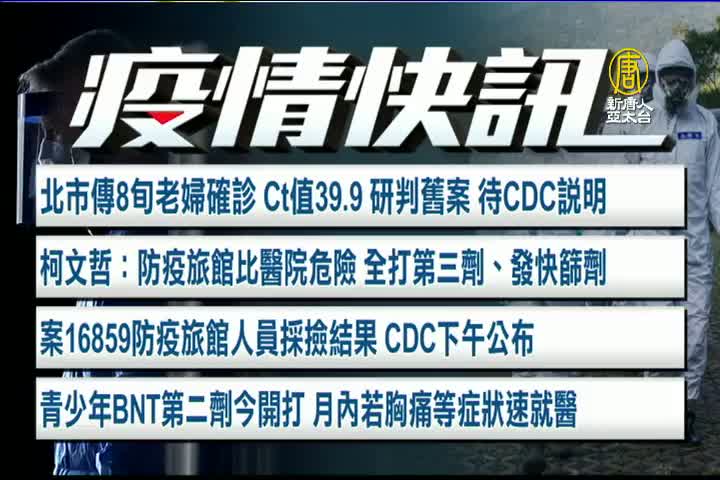 【新唐人亞太台 2021 年 12 月 16 日訊】新聞開始先來關心,台灣最新的疫情動態,台北市傳出一名8旬老婦人確診,Ct值39.9,研判病毒含量低,是本土舊案,待指揮中心說明。另外,台北市長柯文哲說:防疫旅館比醫院危險,要求將員工造冊全打第三劑,並說防疫旅館要發快篩劑,如果有人有症狀就立刻快篩。另外,防疫旅館的兩名確診旅客是否有交互感染?飯店人員的採撿結果,今天下午公布。最後帶您看到,青少年BNT第二劑今天開打,提醒民眾,如果28天內出現胸痛或是心悸等症狀請儘速就醫。