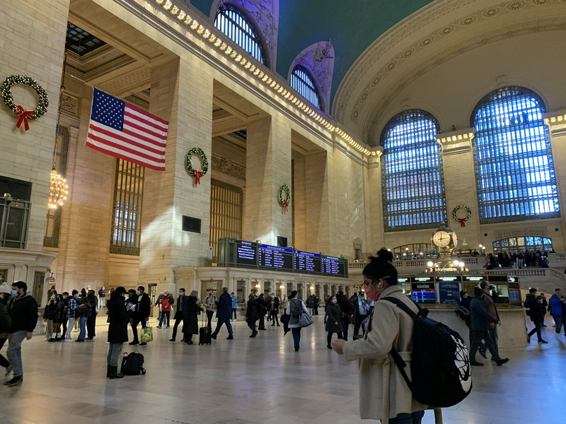 紐約市COVID-19疫情在新變異病毒株Omicron壓境下迅速升溫,行經中央車站大廳的民眾戴口罩防疫。(圖/中央社)