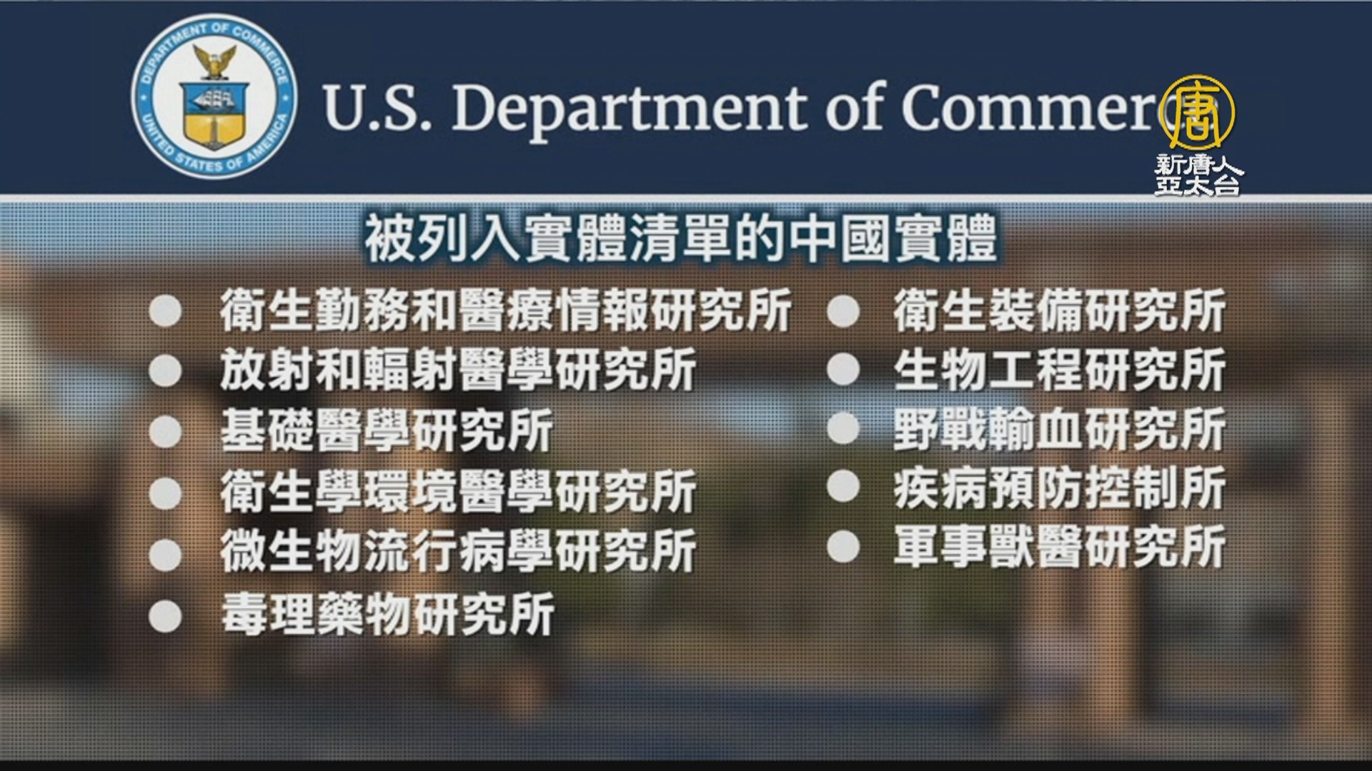 此次被列入實體清單的中國實體,包括中共軍事醫學科學院(AMMS)及其11個利用生物技術支持中共軍方的科研機構,分別是:衛生勤務和醫療情報研究所、放射和輻射醫學研究所、基礎醫學研究所、衛生學環境醫學研究所、微生物流行病學研究所、毒理藥物研究所、衛生裝備研究所、生物工程研究所、野戰輸血研究所、疾病預防控制所以及軍事獸醫研究所。