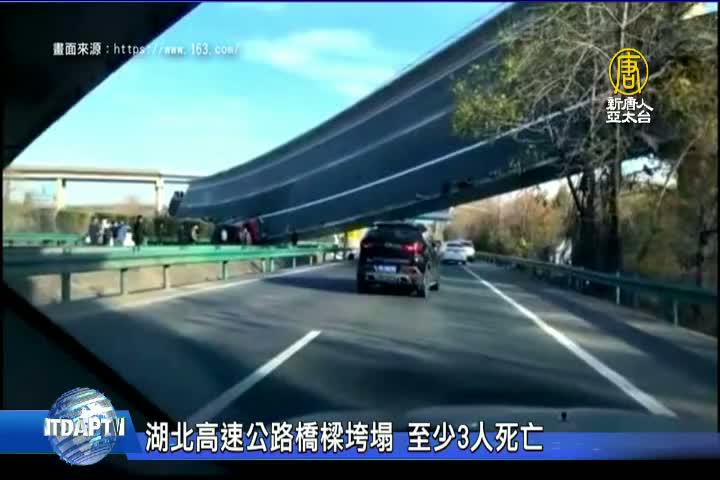 【新唐人亞太台 2021 年 12 月 18 日訊】中國湖北鄂州境內一座高架橋在今天下午3點半,發生垮塌事故,造成交通中斷,導致至少3人死亡。據現場影片顯示,有幾輛大貨車隨著橋面坍塌而墜橋側翻,下層路面上有通行的車輛被橋面砸中,救援工作仍在進行,具體傷亡情況和事故原因仍在調查。