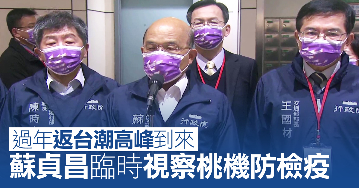 在衛福部長陳時中、防疫團隊、交通部長王國材等人陪同下,行政院長蘇貞昌到桃園機場視察邊境防疫。呼籲國人,過年期間返台,與家人朋友相聚,要貫徹指揮中心防疫規範,才能保護自己、家人朋友和國家社會。另外,也為辛苦的邊境防檢疫人員打氣。