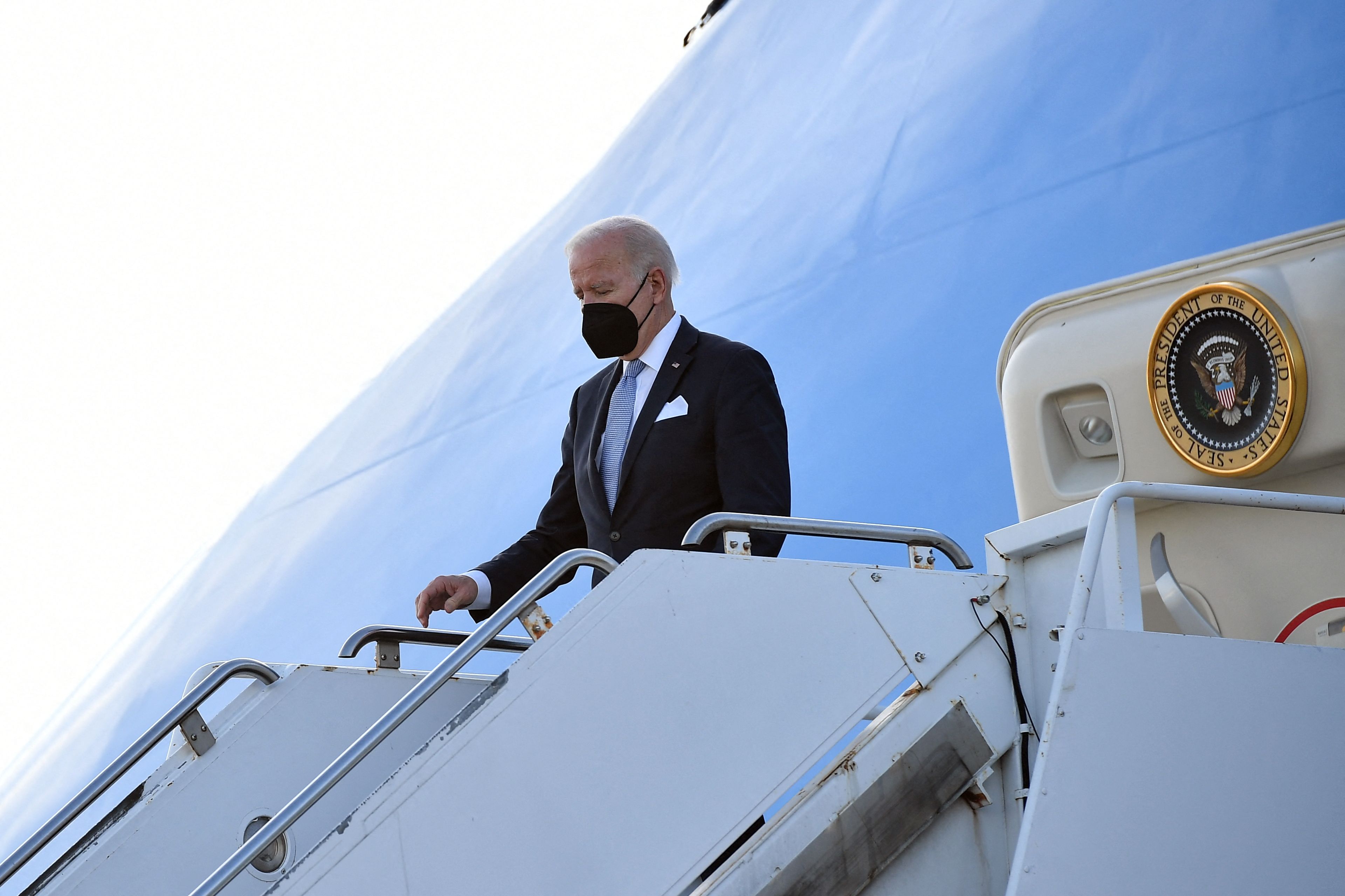 白宮表示,美國總統拜登接受COVID-19採檢呈陰性反應。拜登先前被告知,17日在空軍一號上與他近距離接觸約30分鐘的一名白宮中階幕僚驗出陽性。圖為17日拜登搭乘空軍一號抵達費城國際機場(Philadelphia International Airport)。(圖/GettyImages)