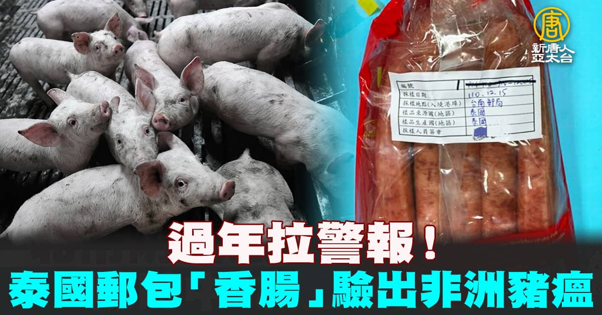 【新唐人亞太台 2021 年 12 月 23 日訊】非洲豬瘟的疫情在國際間仍然嚴峻!農委會主委陳吉仲指出家衛所從泰國郵包,查獲香腸檢出非洲豬瘟陽性,雖然泰國還不是非洲豬瘟的疫區,但台灣還是將東南亞國家列入高風險地區,還好台南郵局在分送前的檢查步驟,發現可疑農畜產品,通知防檢局攔截。