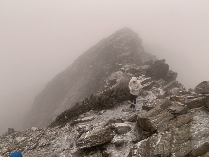 大陸冷氣團南下,低溫配合水氣,玉山25日降雪,玉山國家公園管理處提醒山友,注意步道路面溼滑及保暖,做好自身風險評估,不要勉強攀登,以確保自身安全。(圖/玉管處提供)