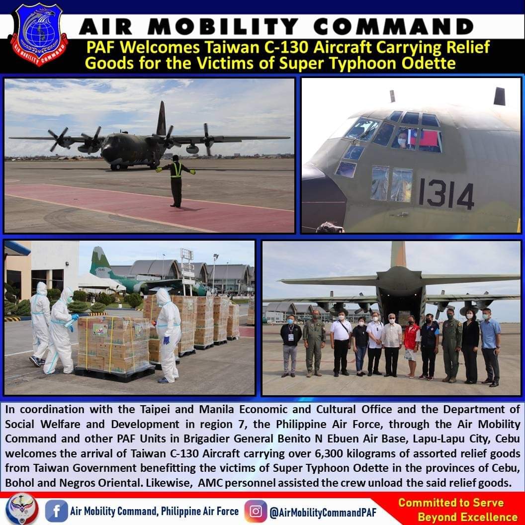 另外,菲律賓空軍在臉書粉絲團「Air Mobility Command,Philippine Air Force」上貼文指出,正值聖誕節,經菲律賓空軍、台北和馬尼拉經濟文化辦事處、社福機構協調,菲律賓空軍在宿霧歡迎載送超過6300公斤的救援物資、來自台灣的C-130運輸機飛抵菲律賓,