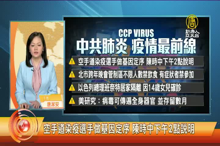 【新唐人亞太台 2021 年 12 月 27 日訊】再來關心疫情,今早還有哪些最新動態,空手道代表團11名染疫選手及教練做基因定序,陳時中下午2點說明。北市跨年晚會管制區不限人數禁飲食,有症狀者禁參加。以色列總理班奈特居家隔離,因為14歲女兒確診。美國研究指出:病毒可傳遍全身器官,並存留數個月。