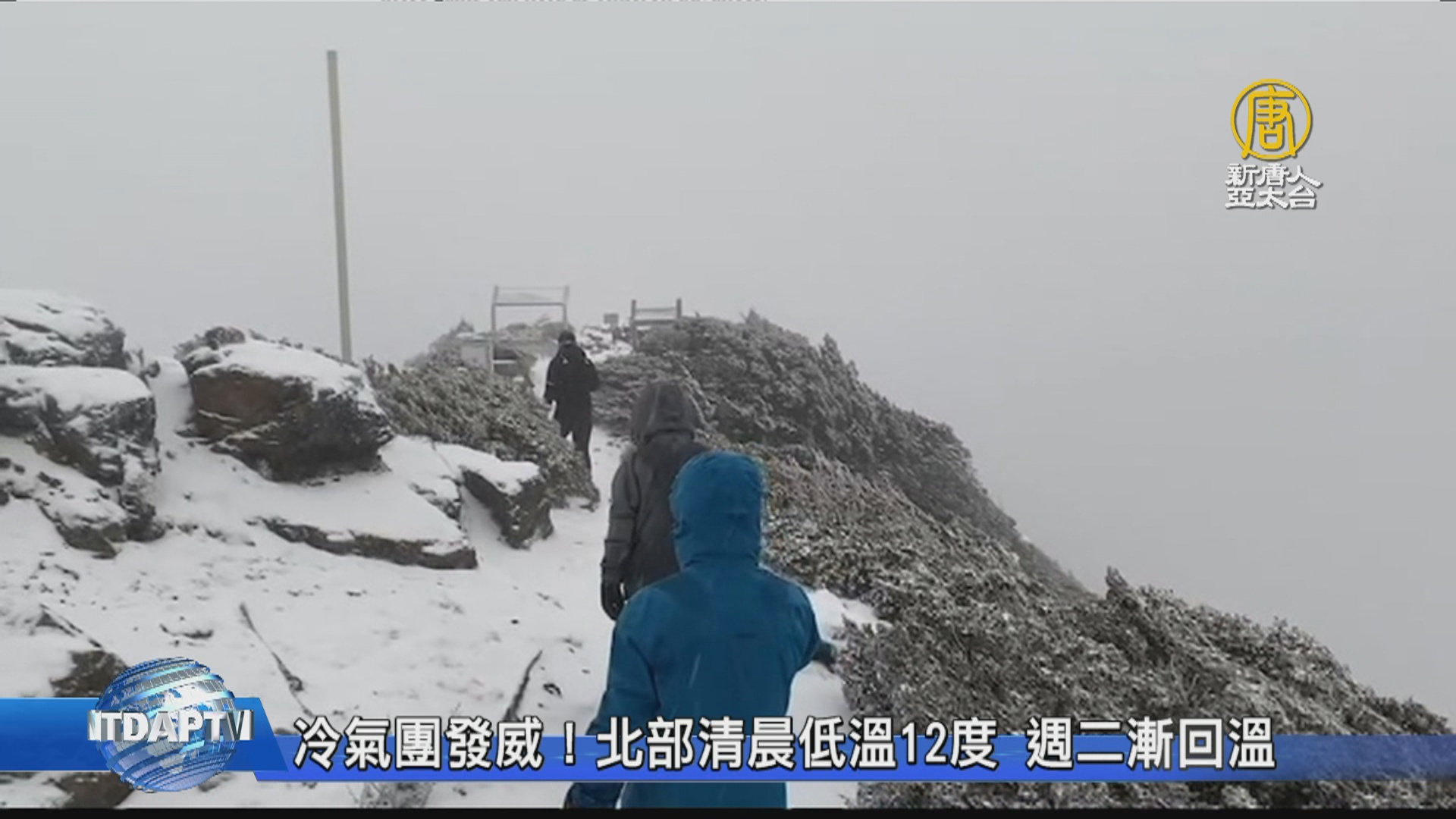 玉山觀測站一片白茫茫,積雪有2公分,受到大陸冷氣團及華南雲雨區東移影響,整體天氣偏濕冷,週一本島平地最低溫在台中大甲,只有10.4度,中部以北、及東北部地區,清晨低溫只有12~14度,其他地區則是15~16度,不過週二以後氣溫會慢慢回升。