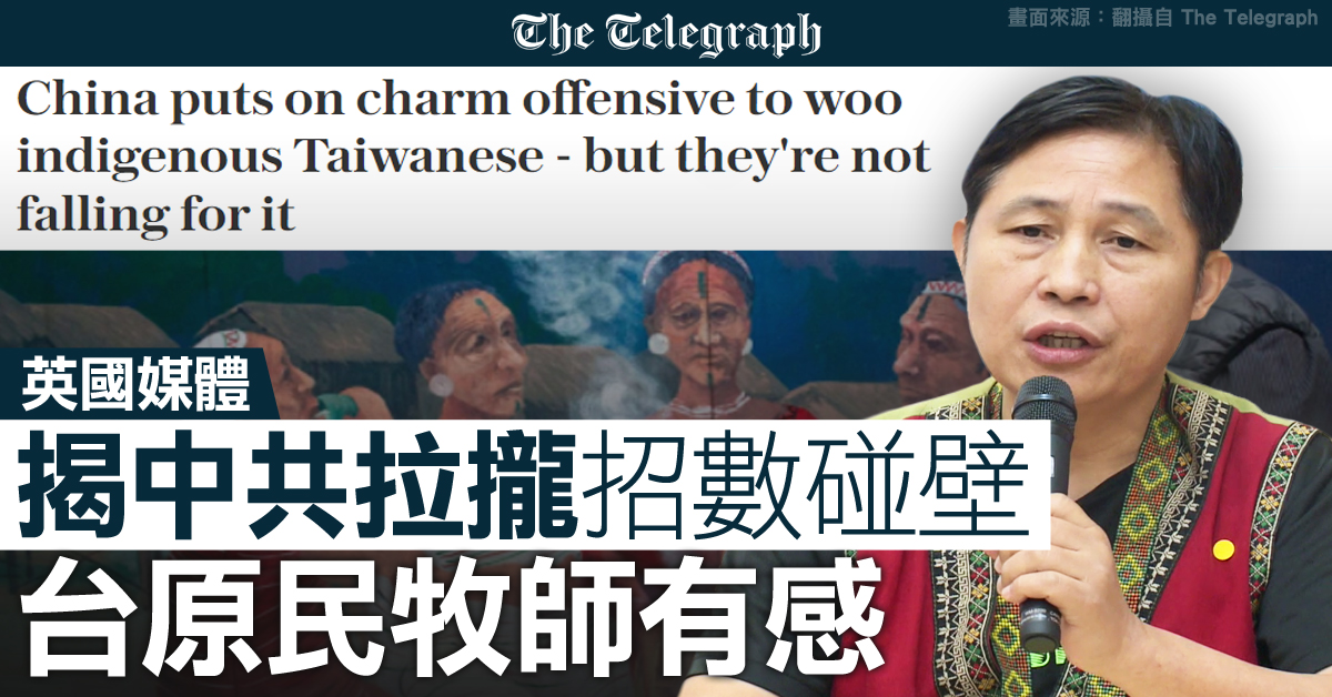 英國《每日電訊報》25日報導,標題「是中共發動攻勢吸引本土台灣原民,但他們並沒有上當」。報導指出,自1980年代以來,中共一直通過資助旅行等活動來拉攏原住民,甚至利用他們來佐證中共統一台灣的所謂「合理性」。
