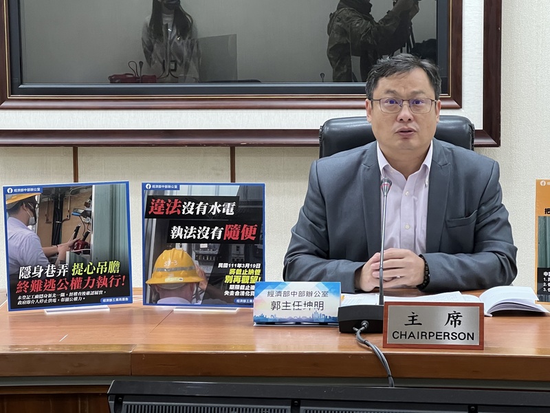 經濟部中部辦公室主任郭坤明今天下午主持「呼籲未登工廠儘速申請納管暨說明斷水斷電成效」記者會,會中說明工輔法修正後的最新進度。