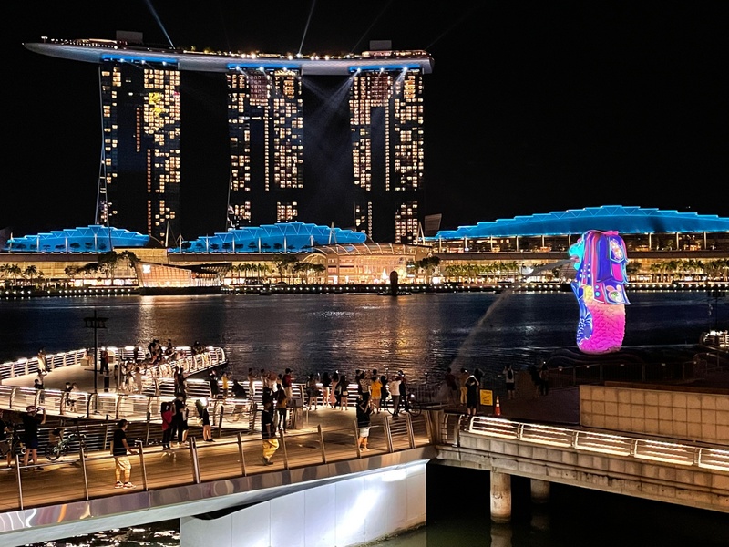 儘管是平日晚上,濱海灣的燈光秀及投影秀都吸引不少民眾駐足觀賞、拍照,彷彿大家都漸漸習慣疫情下的生活。
