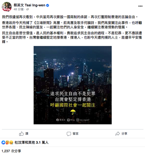 蔡英文指出,很遺憾再次看到,中共當局再次撕毀一國兩制的承諾,再次打壓箝制香港的言論自由,香港政府今天拘捕了《立場新聞》高層、前高層及歌手何韻詩,我們高度關注此事件,也呼籲世界各國、民主陣線的盟友,一起關注他們的人身安全,繼續關注香港情勢的發展。