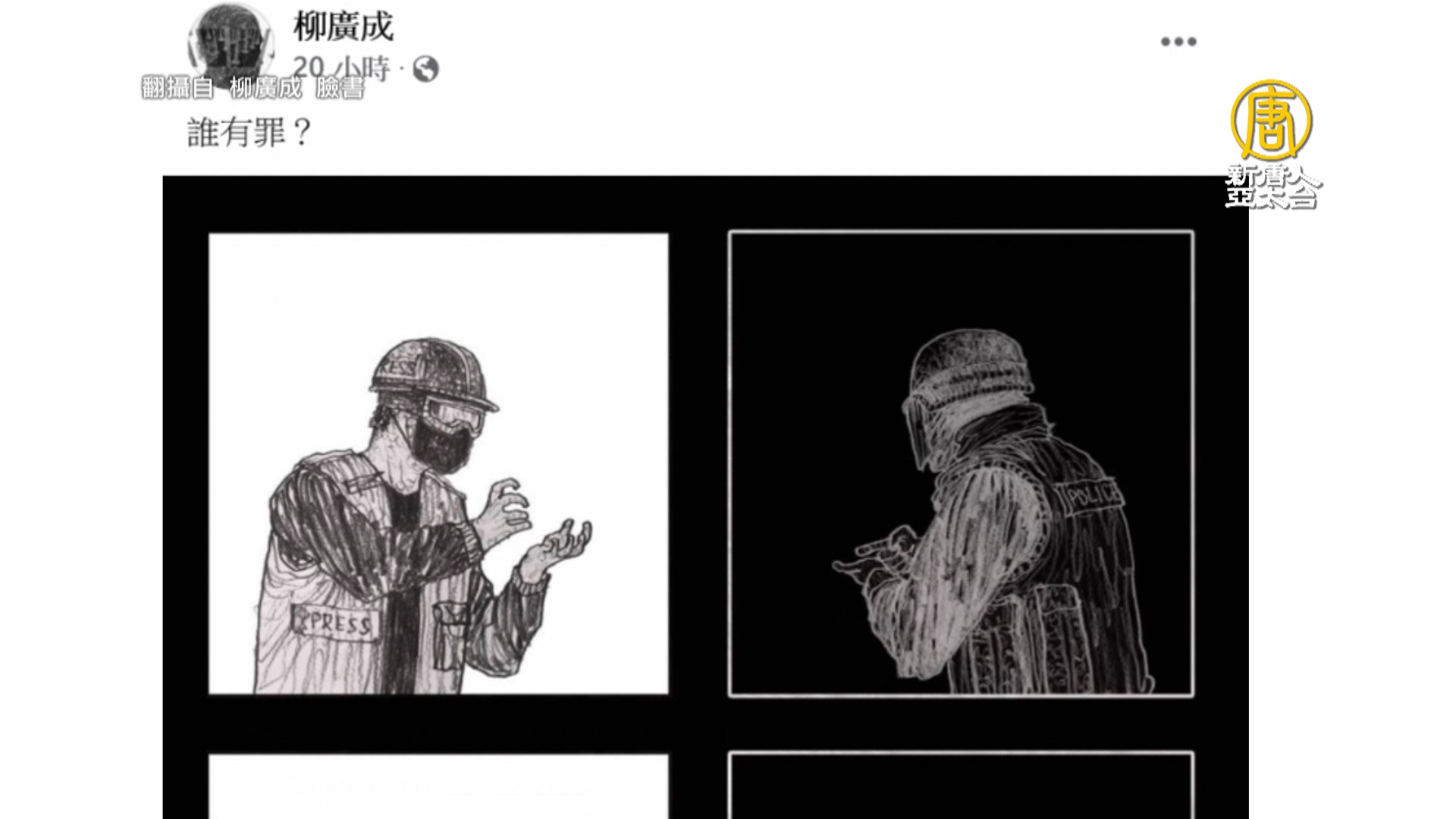 【新唐人亞太台 2021 年 12 月 30 日訊】港警昨天突襲親民主派網媒《立場新聞》的辦公室,凍結資產,並抓捕多名現任和前任高層人員,理由是所謂《串謀發布煽動刊物罪》,消息引起國際震驚。今年7月到台灣居住的香港漫畫家柳廣成以鉛筆畫下他們的背影,聲援立場新聞,作品被大量轉載。柳廣成寫下「誰有罪」三個字,作品中可以看到,手無寸鐵的香港記者對比港警,記者的照相機,對比警察的手槍。有網友感慨寫下,「莫須有的年代正式來臨」。