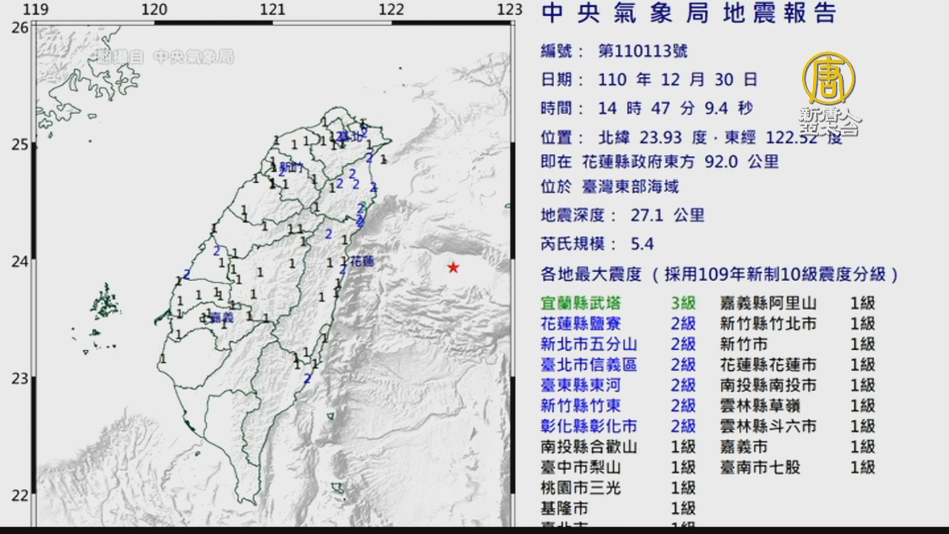 【新唐人亞太台 2021 年 12 月 30 日訊】再來看到,台灣東部海域今天下午2點多,接連發生規模 3.9與 5.4的地震,其中規模5.4的震央出現在花蓮縣政府東方92公里處,深度27.1公里,最大震度為3級。中央氣象局表示,未來 2-3天不排除有規模 4以上餘震出現,屬於正常能量釋放,民眾不必擔心。