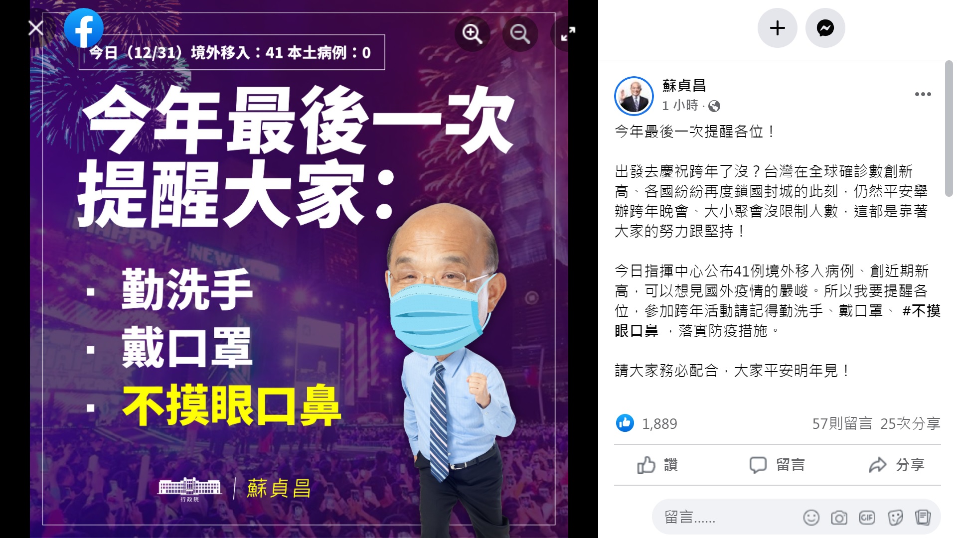 行政院長蘇貞昌(圖)今天說,指揮中心公布41例境外移入病例,創近期新高,可以想見國外嚴峻,提醒民眾參加跨年活動時,務必勤洗手、戴口罩、不摸眼口鼻,落實防疫措施。(圖/翻攝自蘇貞昌臉書)
