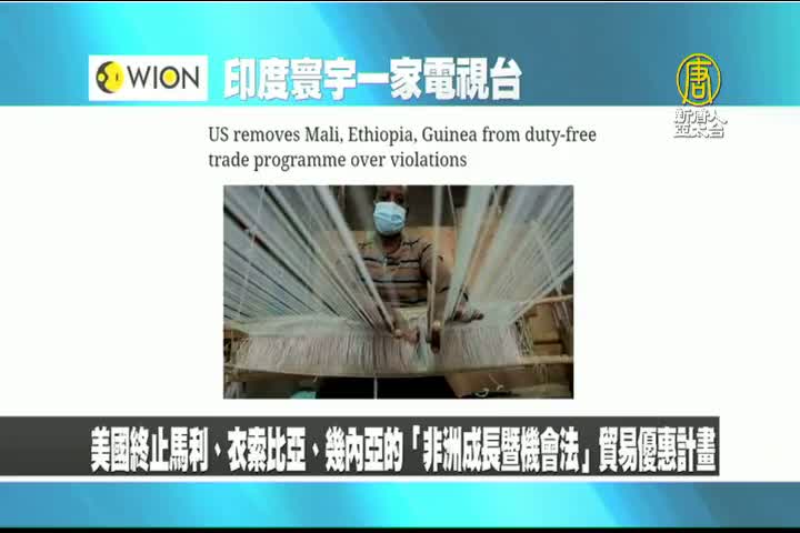 【新唐人亞太台 2022 年 01 月 03 日訊】最後是印度寰宇一家電視台報導:由於馬利、衣索比亞、和幾內亞政府行徑觸犯「非洲成長暨機會法」(AGOA)條例,美國昨天終止3國的貿易優惠計畫。