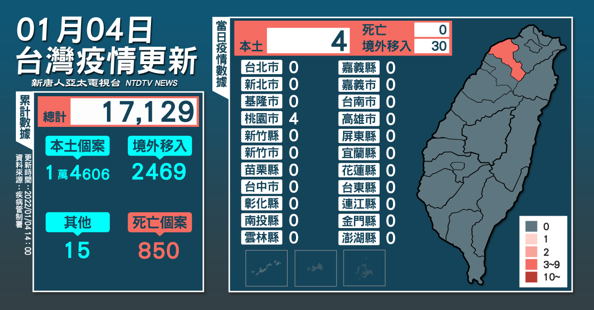 【新唐人亞太台 2022 年 01 月 04 日訊】中央流行疫情指揮中心今(4)日公布,國內新增30例境外移入,與4例本土案,其中包括昨晚公布的桃園機場女清潔員案(17230),與今日公布的兩名清潔員(案17238、案17239),與1名防疫車隊司機(案17240)。在確診個案中無新增死亡。