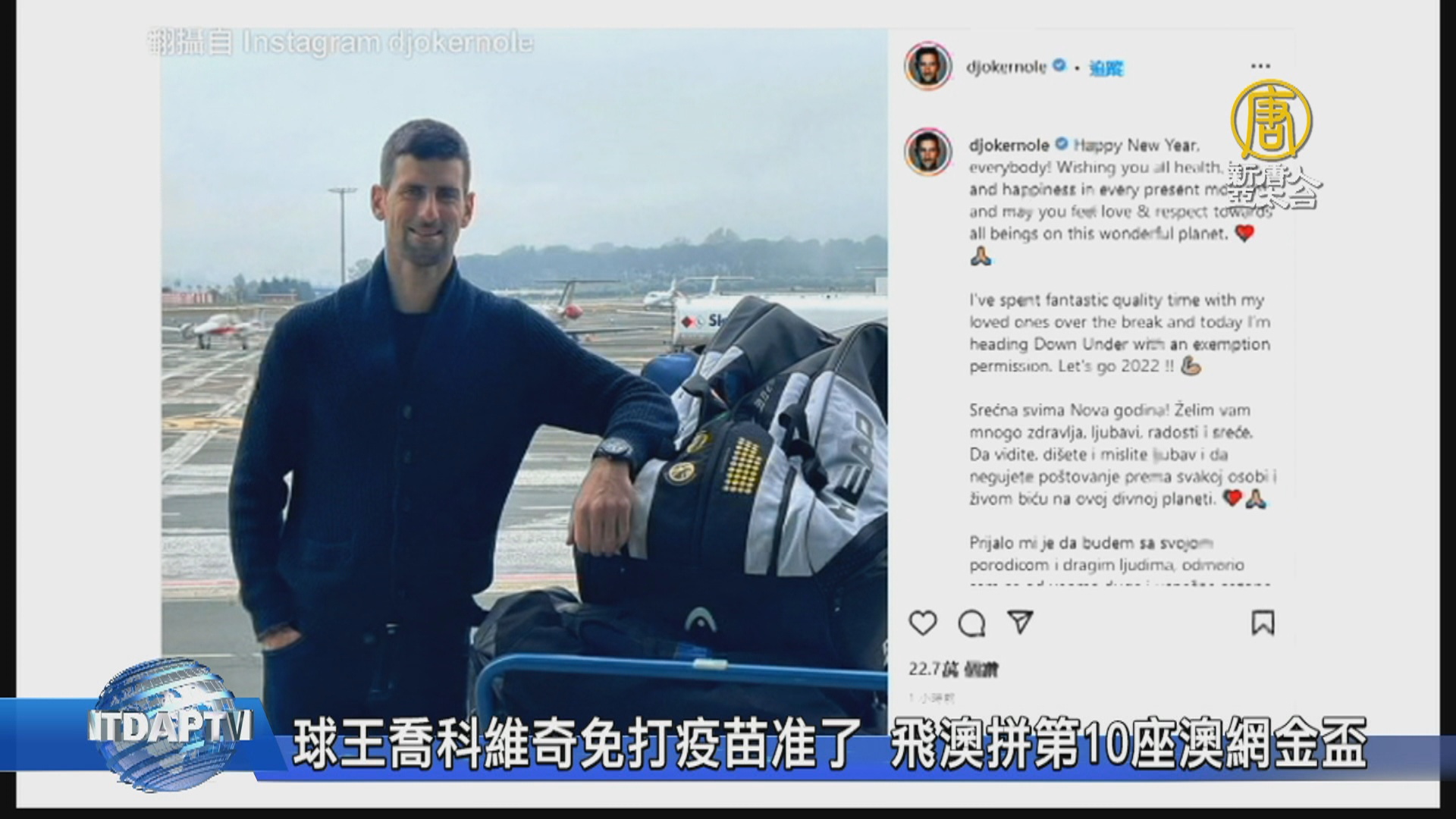 【新唐人亞太台 2022 年 01 月 04 日訊】澳洲網球公開賽在即,原本各界都在揣測球王喬科維奇(Novak Djokovic)動向,終於在今天(4日)有結果。澳網點頭給予醫療豁免,喬科維奇不用接種疫苗,並在今天宣布,將前往墨爾本參與2022澳洲公開賽。喬科維奇在IG上面寫下,「休息時間和所愛的人度過美好時光,今天我在獲得豁免許可的情況下前往澳洲,開打吧2022!」而澳洲公開賽將在17號開戰,也將是喬科維奇尋求第10座澳網男單金盃。