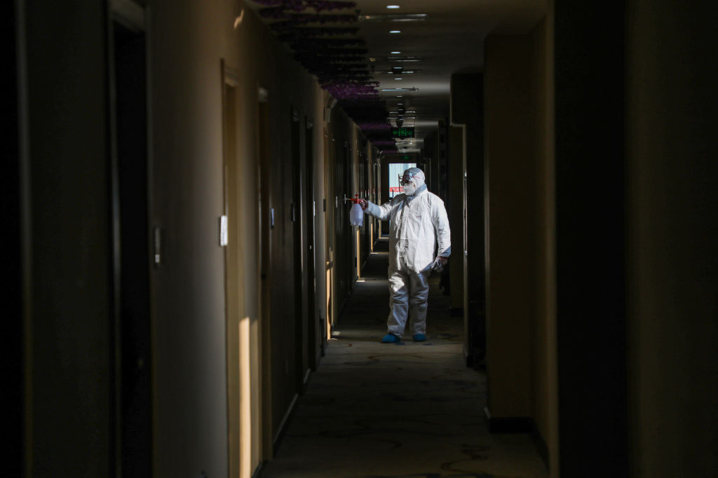 中央流行疫情指揮中心今天定調台北市中山區某防疫旅館為Delta群聚案,台北市政府表示,此防疫旅館即日起所有旅客只出不進,將協助轉介後續已訂房30名旅客,並安排環境採檢。圖為一消毒人員門口清潔資料照。(圖/GettyImages)