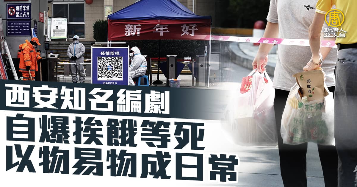 陝西西安全城出動近3萬警力參與封城,1300萬居民10多天來被封閉在家,因食物不足,鄰居之間以物易物的方式解決吃飯問題。物資匱乏到甚至有民眾用電玩、手機來交換食物。網傳西安的著名編劇自爆在挨餓在死亡,卻什麼都不能說。