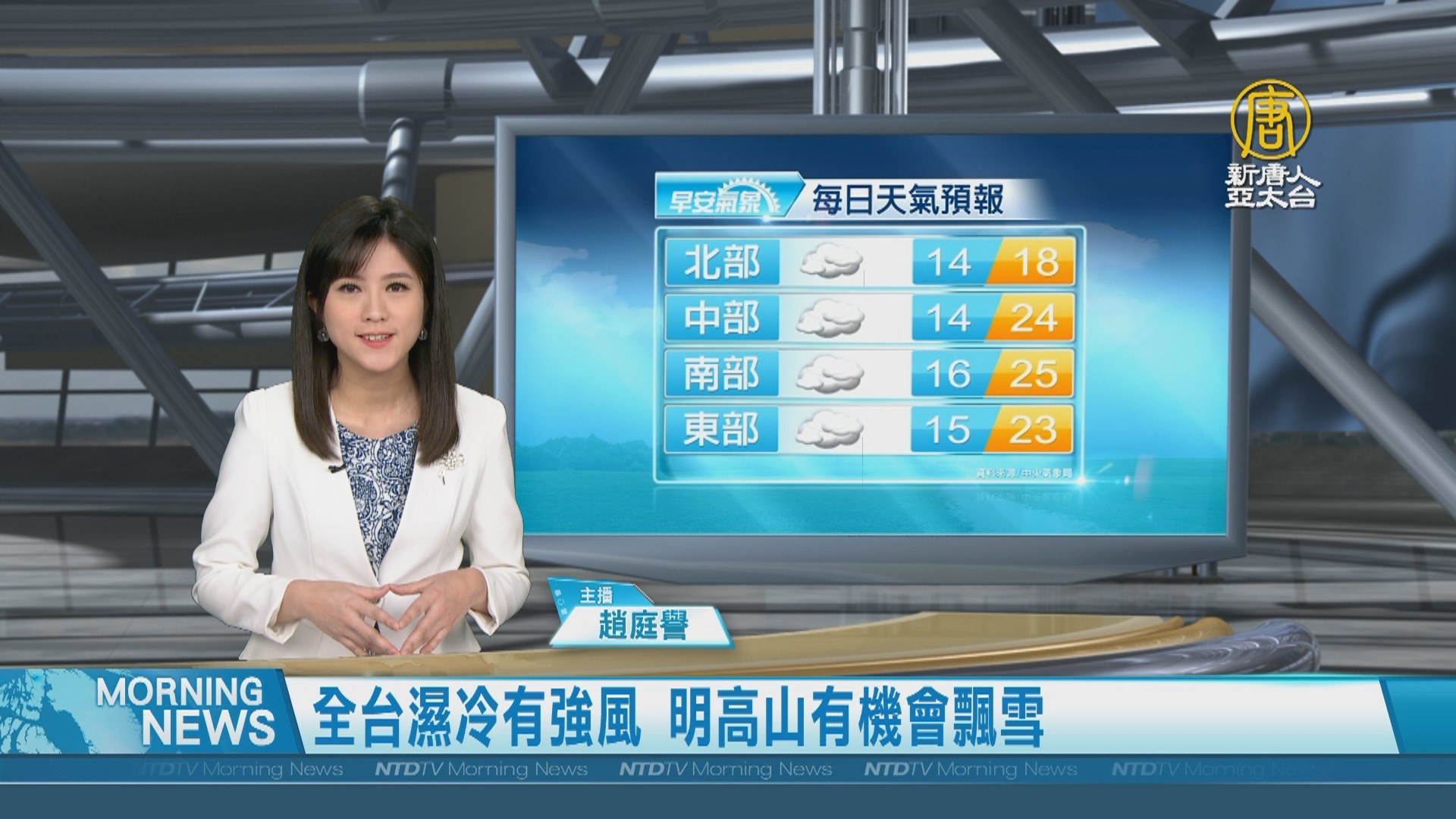 【新唐人亞太台 2022 年 01 月 06 日訊】歡迎您收看1月6日的早安新唐人,我是趙庭譽,先來帶您關心天氣。今天白天東北季風增強,北部及東北部天氣較涼,氣象局預估,這波東北季風將影響到週日(9日),最低溫時間點落在星期五,北台灣將下探至14度,提醒觀眾朋友留意。帶您一起來看到國際媒體重要訊息。