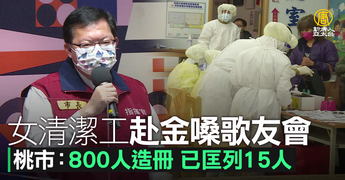 【新唐人亞太台 2022 年 01 月 06 日訊】新聞開始先來關心,桃園機場清潔人員爆發群聚感染,目前確診人數共8人。其中的1名女清潔工,曾到桃園市中壢區金嗓歌友會,對此,桃園市政府已造冊800人,在今天(6日)上午進駐金嗓歌友會協助採檢。初步疫調,已匡列15人。預計下午能全數採檢完畢。