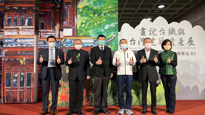 因應桃園機場群聚感染案,新北市長侯友宜(右3)6 日上午出席「畫說台鐵與台灣建築遺產展」開幕活動,會後接受媒體聯訪時,呼籲大家拍照時務必戴口罩。桃園機場群聚感染,昨天新增3名確診者中,有1人住在新北。新北市長侯友宜今天說,經匡列採檢2名同住家人,結果皆為陰性,確診個案活動史主要在桃園市內,會持續釐清接觸者。(圖/中央社)
