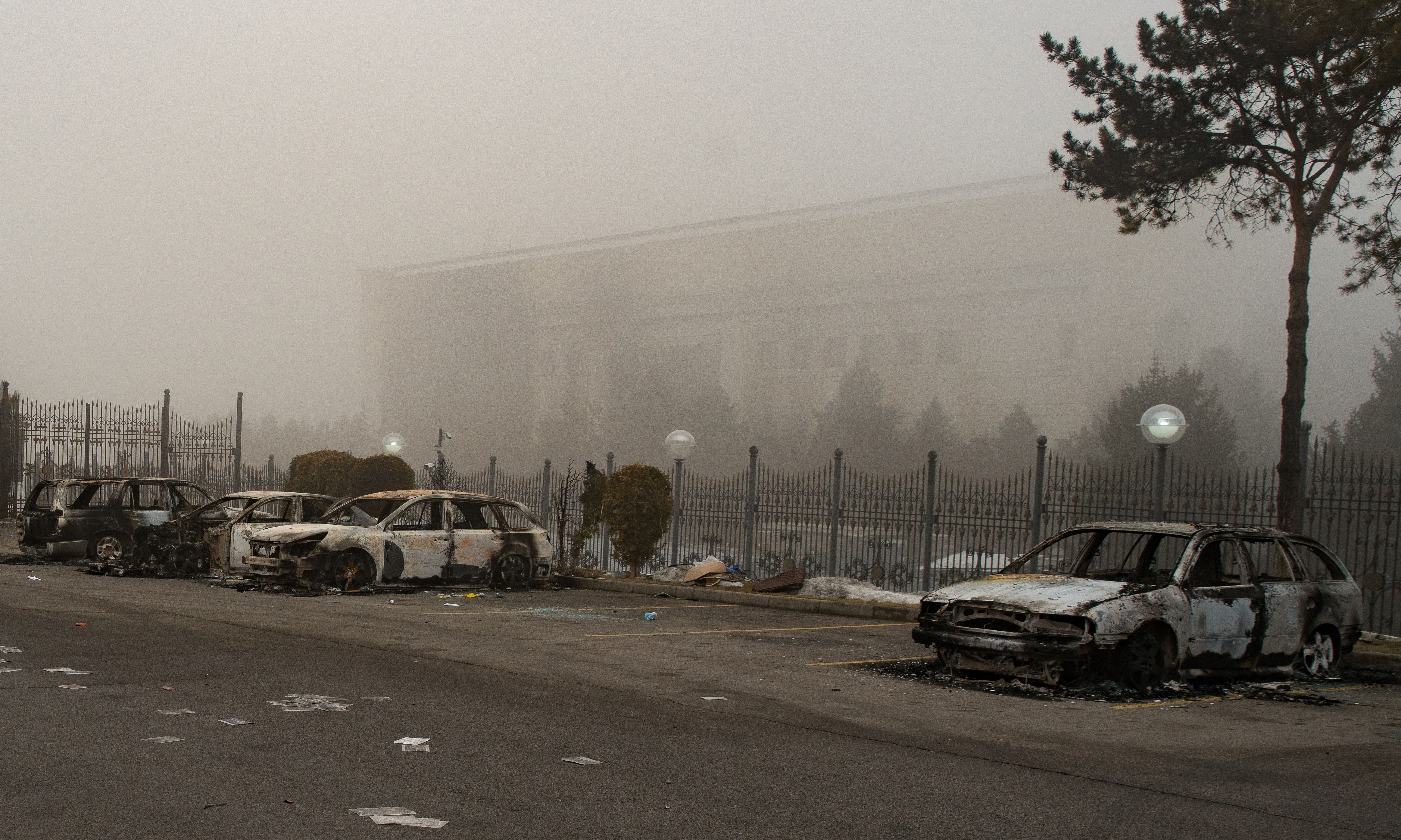 中亞國家哈薩克發生動亂,最大城市阿拉木圖(Almaty)的共和國廣場(Republic Square)成為抗議者主要聚集地,槍響頻傳。媒體報導,維安部隊今天對此廣場實施清場。圖為阿拉木圖市中心的行政大樓附近,一處停車場的汽車被燒毀。(圖/GettyImages)