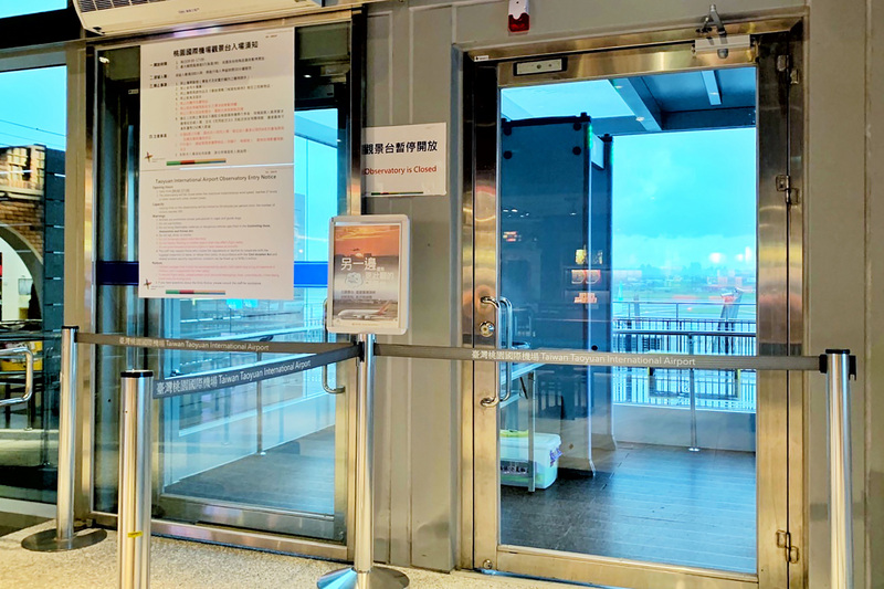 桃園機場發生群聚案,桃園國際機場公司為進行疫情管控,關閉第二航廈南北擴建區的戶外觀景台。(圖/中央社)