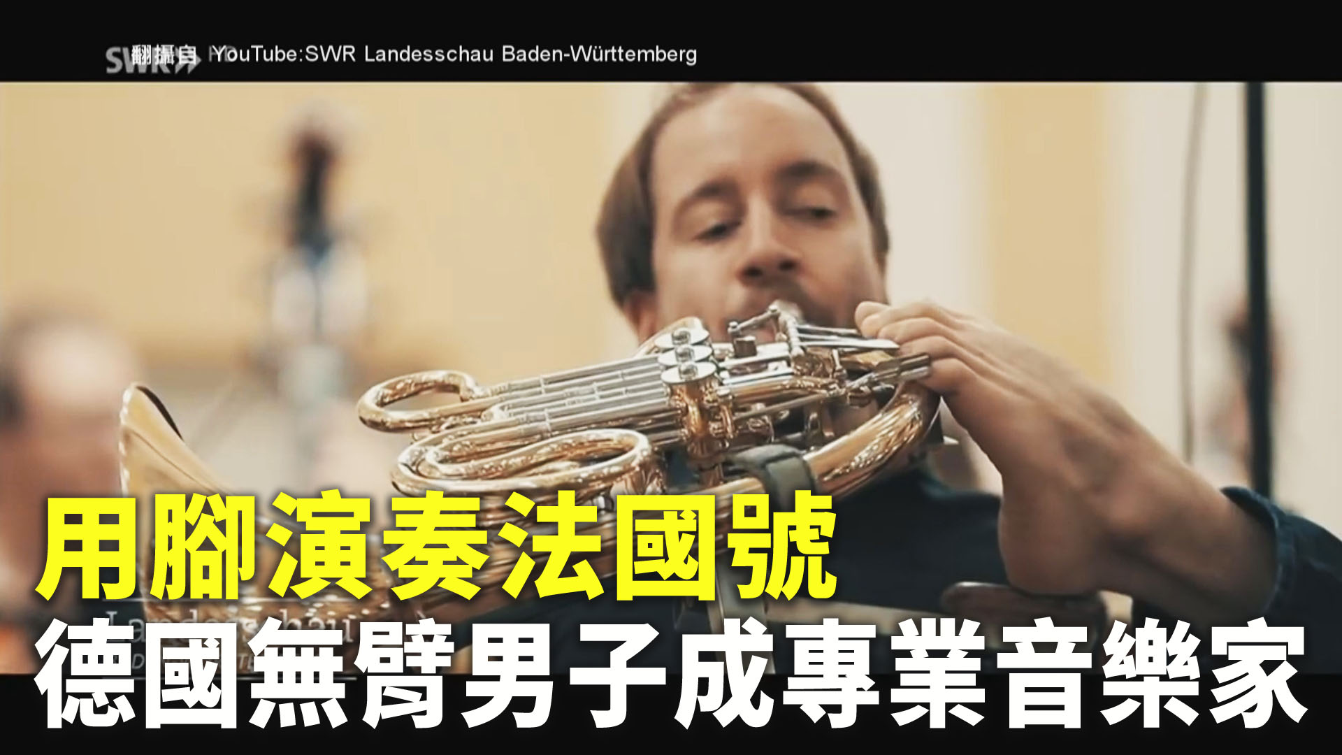 【新唐人亞太台 2022 年 01 月 08 日訊】德國一名男子自幼就沒有雙臂。雖然天生條件不足,但他憑藉著後天的努力,成為一名用腳演奏的專業法國號演奏家,而且在世界各地巡迴演出,受到人們的尊敬。
