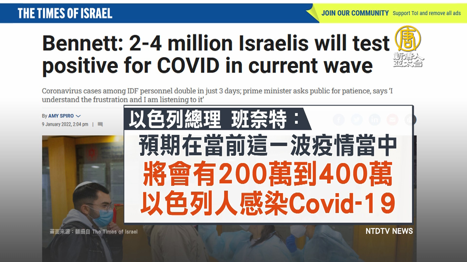 《以色列時報》(The Times of Israel)報導,以色列總理班奈特(Naftali Bennett)9號表示,預估這一波迅速擴散的疫情,將有高達200至400萬人染疫,這數字相當於以色列約40%的人口。