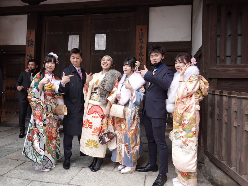 東京都台東區今天在淺草寺附近的淺草公會堂舉行成人式,為了避免出席者擁擠,不利防疫,因此上下午各舉行一場。參加嚴肅的成人式後,許多新成人踏出禮堂後,有的互相擁抱,有的忙著合照,顯得相當興奮。主要因為受到疫情影響,許多大學長期採遠距視訊教學,學生們難得碰面。