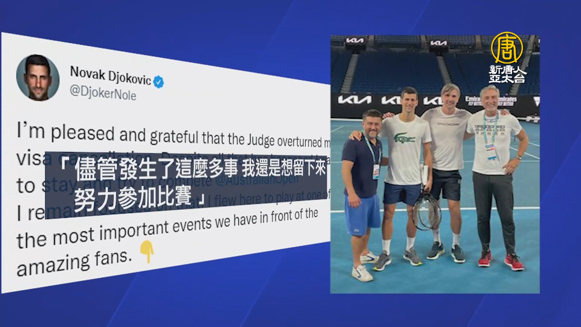 【新唐人亞太台 2022 年 01 月 11 日訊】網球名將喬科維奇因為疫苗豁免問題被澳洲政府拒絕入境,不過1月10日,案件出現轉機,當地法官裁決,恢復喬科維奇的簽證,喬帥繼續備戰澳網公開賽。