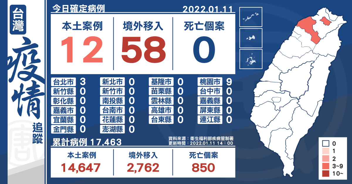 【新唐人亞太台 2022 年 01 月 11 日訊】今(11)日中央流行疫情指揮中心公布,國內新增12例本土個案及58例境外移入;另確診個案中無新增死亡。