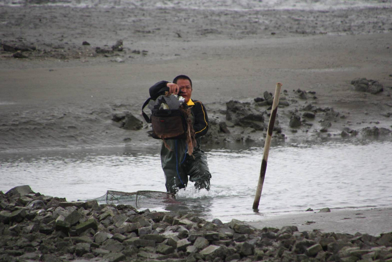 F-16V戰機11日墜海,飛行官陳奕仍失聯。民間巡守隊12日上午在事故現場附近的岸邊蚵架上發現軍機殘骸。 (圖/中央社)