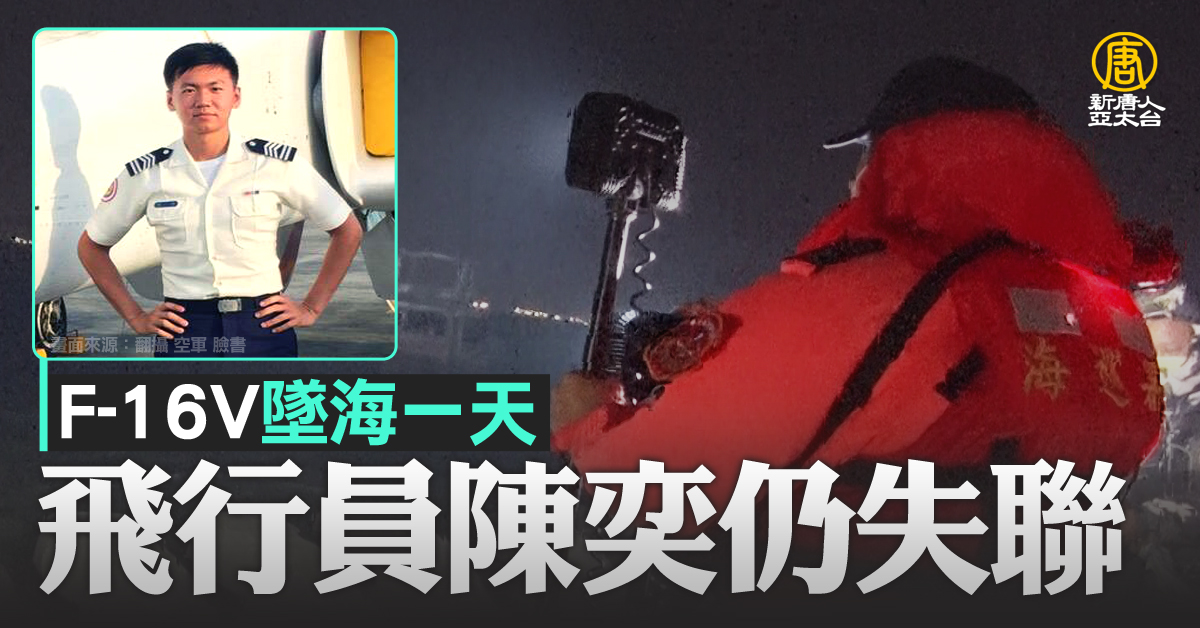 2022-01-12 11:22:14早安新唐人先來關心,國軍空軍嘉義基地所屬一架F-16V,昨天(11日)下午3點多在嘉義東石外海執行訓練時,不慎失事墜海,機上駕駛陳奕上尉,目前下落不明,軍方徹夜搜救,每5分鐘投照明彈。另外,海水陸續退潮,海軍水下作業大隊也派員潛水搜救。國防部指出,戰機大角度墜海,陳奕上尉並沒有跳傘,而且,飛官持續按下麥克風,以至於無線電無法接收任何訊號,呈現無法發話與收話的情況,目前F-16進行「天安特檢」、全面停飛。
