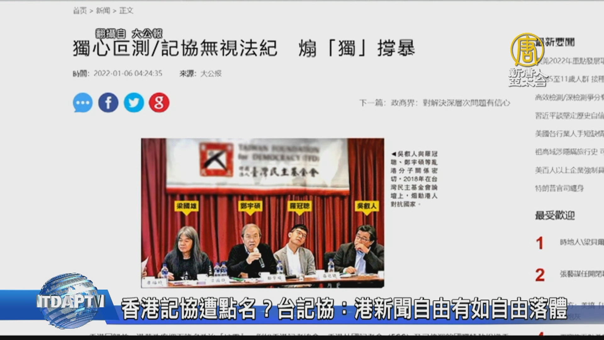 【新唐人亞太台 2022 年 01 月 12 日訊】香港《立場新聞》、《眾新聞》等多家媒體被迫關閉以後,香港記者協會遭到點名壓迫。有親共港媒,以港版國安法罪名,羅織扣帽香港記者協會,及台灣中央研究院學者吳叡人。台灣記者協會常務委員李志德表示,在港版國安法後,香港的新聞自由,幾乎像自由落體往下墜落。