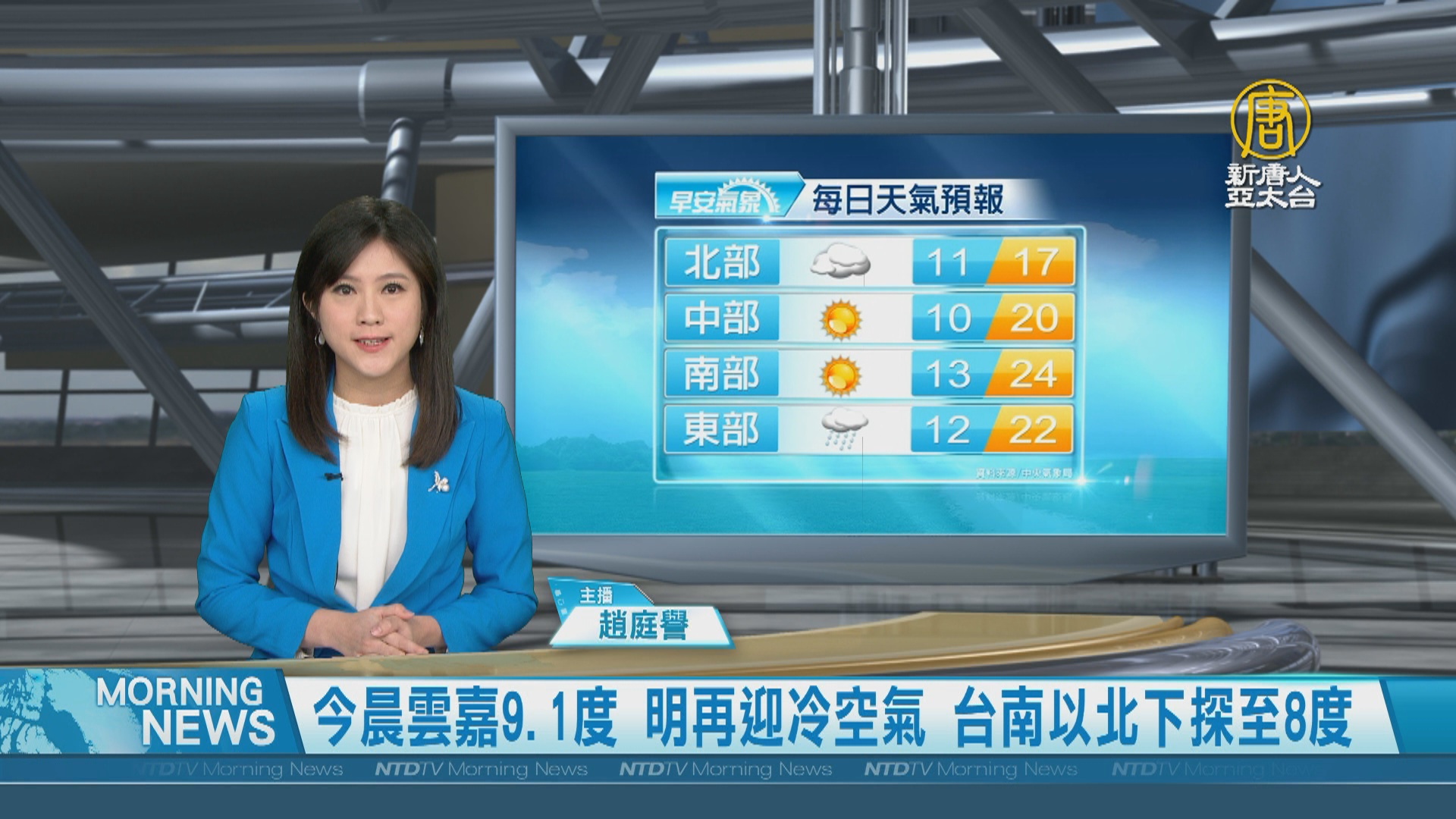 【新唐人亞太台 2022 年 01 月 13 日訊】歡迎您收看1月13日的早安新唐人,我是趙庭譽,先來帶您關心天氣。受強烈大陸冷氣團影響,昨天全台最低溫在苗栗三灣只有攝氏9.1度,而今晨最低溫在雲林、嘉義只有9.1度。氣象局已經對新竹、苗栗、南投、雲林、嘉義及金門發出低溫特報。明天清晨低溫再下降,台南以北下探至8度,預計一直到星期天,才會有比較明顯回溫,帶您一起來看到國際媒體重要訊息。