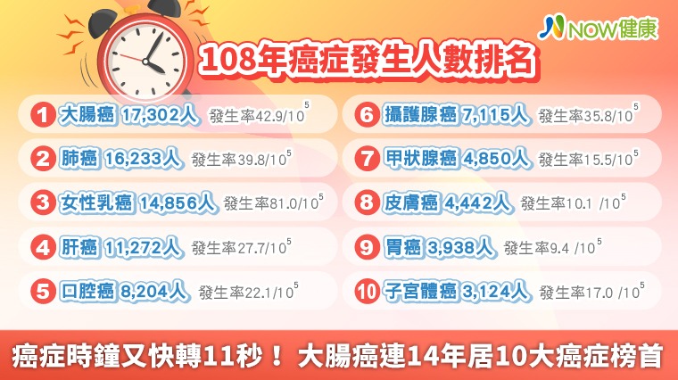 國健署公布最新國人癌症登記報告,108年新增罹癌12萬1254人,平均每4分20秒就有1人罹癌,與107年相較,罹癌人數增加5123人,罹癌時鐘快轉了11秒。在癌症排行榜中,大腸癌連14年位居第1,108年共1萬7302人罹患大腸癌。