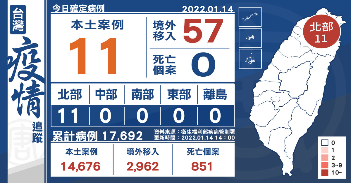 【新唐人亞太台 2022 年 01 月 14 日訊】中央流行疫情指揮中心今天(14日)公布國內新增68例COVID-19確定病例,分別為11例本土個案及57例境外移入;另確診個案中無新增死亡。